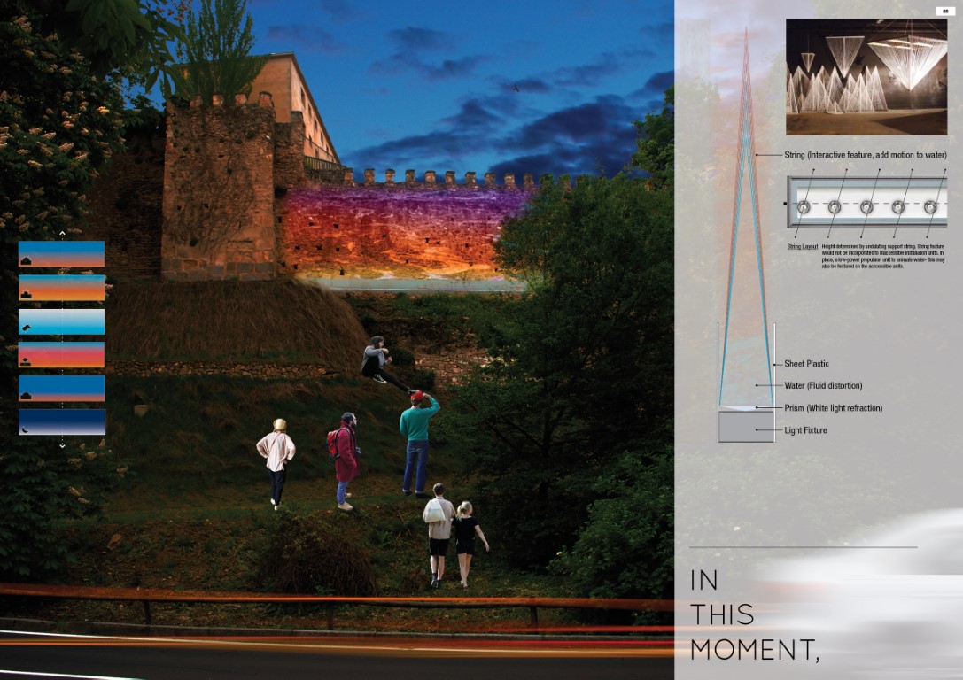 In This Moment artfully proposes a consideration of the passage of time and how it shapes our memory of a place or object. As the Wall of Segovia stands today, nightfall and sunrise choreograph a repetitive environmental phenomenon of its disappearance and reappearance as light diffusion shifts and the Wall’s visibility in the landscape recedes or saturates. Our lighting installation aims to heighten viewers’ attention to this subtle occurrence by mimicking the movement of light in the sky through colour gradients varying by time of day, with fluid motions of water implying the fleeting notion of time. In the daytime, the Wall is re-animated in texture as reflections of water ripples dance on the Wall’s surface. The Wall re-emerges at the onset of dusk, blending with the horizon in brilliant luminescent LED colours.