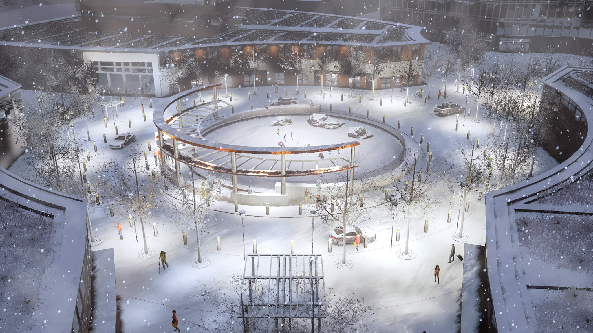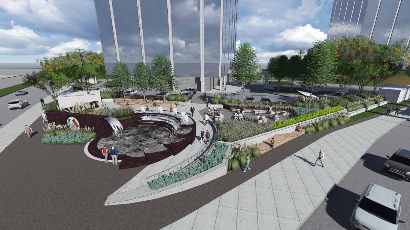 A core principle of our vision for the Queensway Commons mixed-use development was to create a central community place defined and embraced by built form. Core to this place is a circular water feature that transforms to a skating rink during the winter season creating a year round focus to the community. Programmed activities and events will ensure that the central community place will be animated and enjoyed by local residents, workers and visitors.